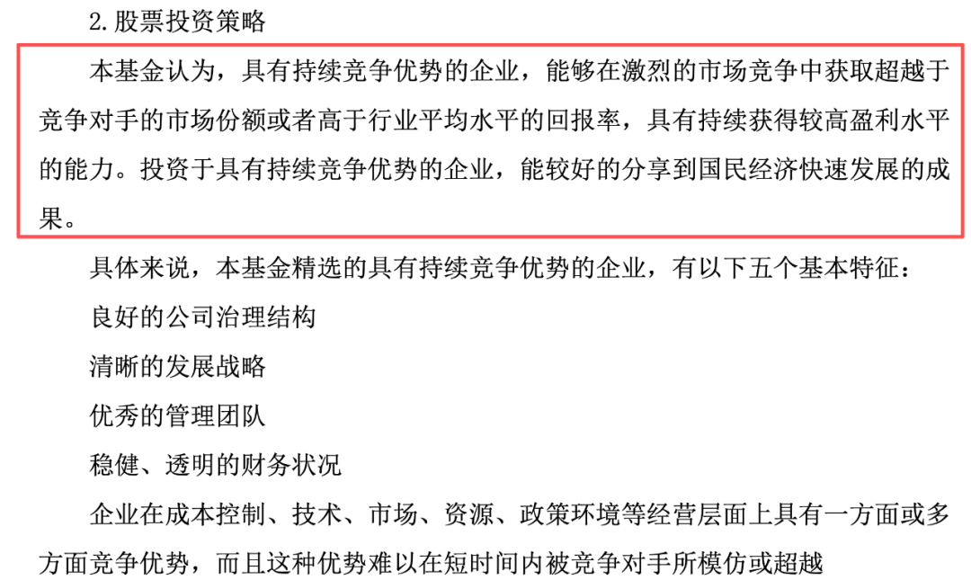 我们需要讨论的一个问题是:按照该基金最初的招募说明书,这应该是一只主要投向能够分享国民经济快速发展成果,具有持续竞争优势的企业。