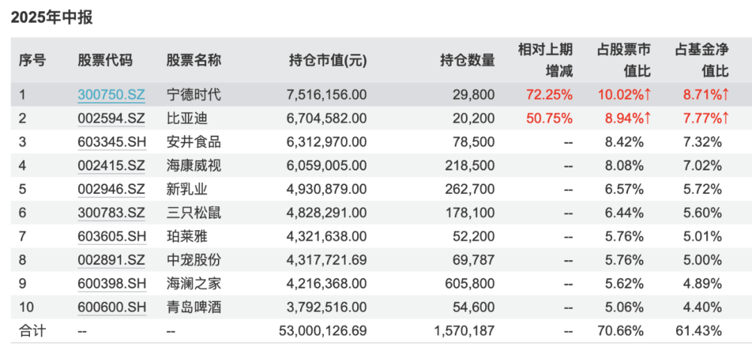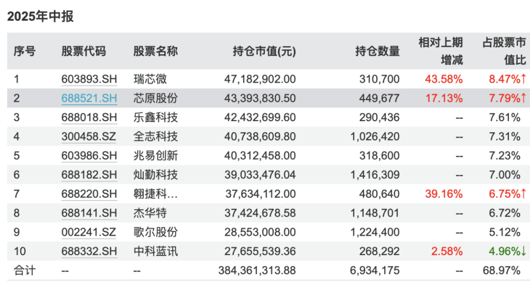 去年三季度第一重仓股是中际旭创,到去年四季度就掉到了第十。今年上半年的前十大重仓股里,没有中际旭创的身影。
