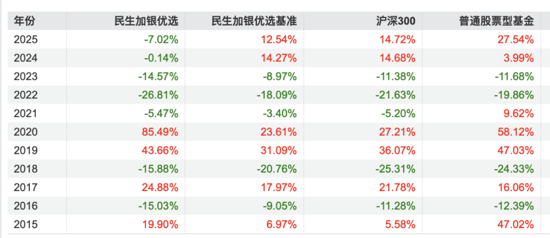但这只老牌基金,也不是只有今年才这么拉胯。从2021年到2025年,这只基金已经连续5年负收益。2015年来的11年,这只基金一共只有4年是正收益,而同类股票型基金,有7年是正收益。