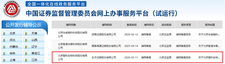 2026-02-18开元棋牌,开元棋牌官方网站,开元棋牌APP下载近日,据中国证券监督管理委员会网上办事服务平台信息显示,北京证监局受理了北京擎科生物科技股份有限公司提交的首次公开发行股票并上市辅导备案的申请,备案时间为2026年2月11日,