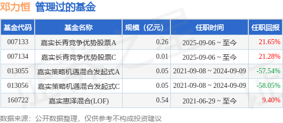 邓力恒先生:中国国籍,硕士研究生学历。2015年11月加入嘉实基金管理有限公司研究部任研究员,现任资产配置投资部策略分析师。2021年9月8日至2024年10月18日担任嘉实策略机遇混合型发起式证券投资基金基金经理。2021年6月29日起担任嘉实惠泽混合(LOF)基金经理。2025年9月6日担任嘉实长青竞争优势股票型证券投资基金基金经理。