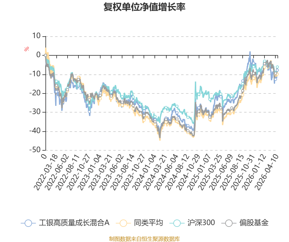 截至4月10日,工银高质量成长混合A近三个月复权单位净值增长率为-2.37%,位于同类可比基金181/265;近半年复权单位净值增长率为-6.06%,位于同类可比基金241/265;近一年复权单位净值增长率为29.16%,位于同类可比基金176/265;近三年复权单位净值增长率为12.44%,位于同类可比基金172/261。