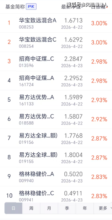 23日开放式基金净值增长排名前10的基金分别是:华宝致远混合(QDII)A、华宝致远混合(QDII)C、招商中证煤炭等权指数(LOF)C、招商中证煤炭等权指数(LOF)A、易方达优势回报混合(FOF-LOF)A、易方达优势回报混合(FOF-LOF)C、易方达全球配置混合(QDII)C(人民币)、易方达全球配置混合(QDII)A(人民币)、格林稳健价值混合A、格林稳健价值混合C。