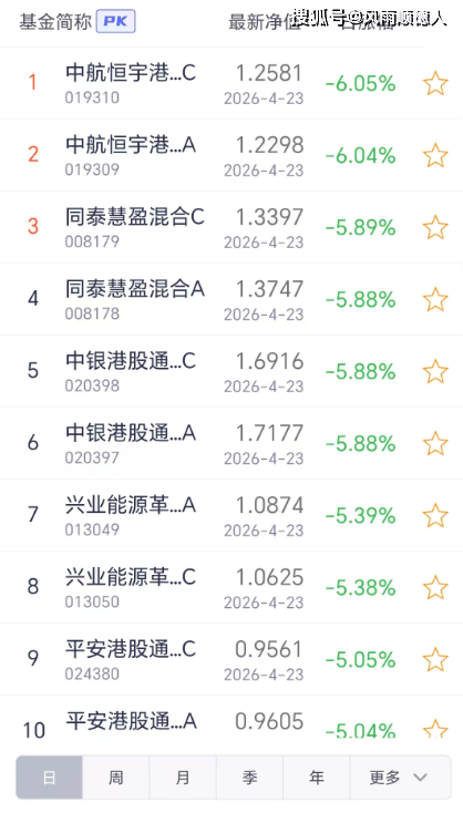23日开放式基金净值增长排名后10的基金分别是:中航恒宇港股通价值优选混合发起C、中航恒宇港股通价值优选混合发起A、同泰慧盈混合C、同泰慧盈混合A、中银港股通医药混合发起C、中银港股通医药混合发起A、兴业能源革新股票A、兴业能源革新股票C、平安港股通医疗创新精选混合C、平安港股通医疗创新精选混合A。